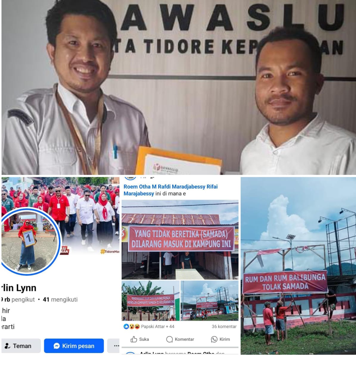 Disamping laporan terhadap pelaku pemasangan Spanduk, Dia juga mencatat ada satu Spanduk yang isinya tertulis ‘Yang Tidak Beretika (SAMADA) dilarang masuk di kampung ini’ terlihat dalam postingan akun FB bernama Arlin Lynn.