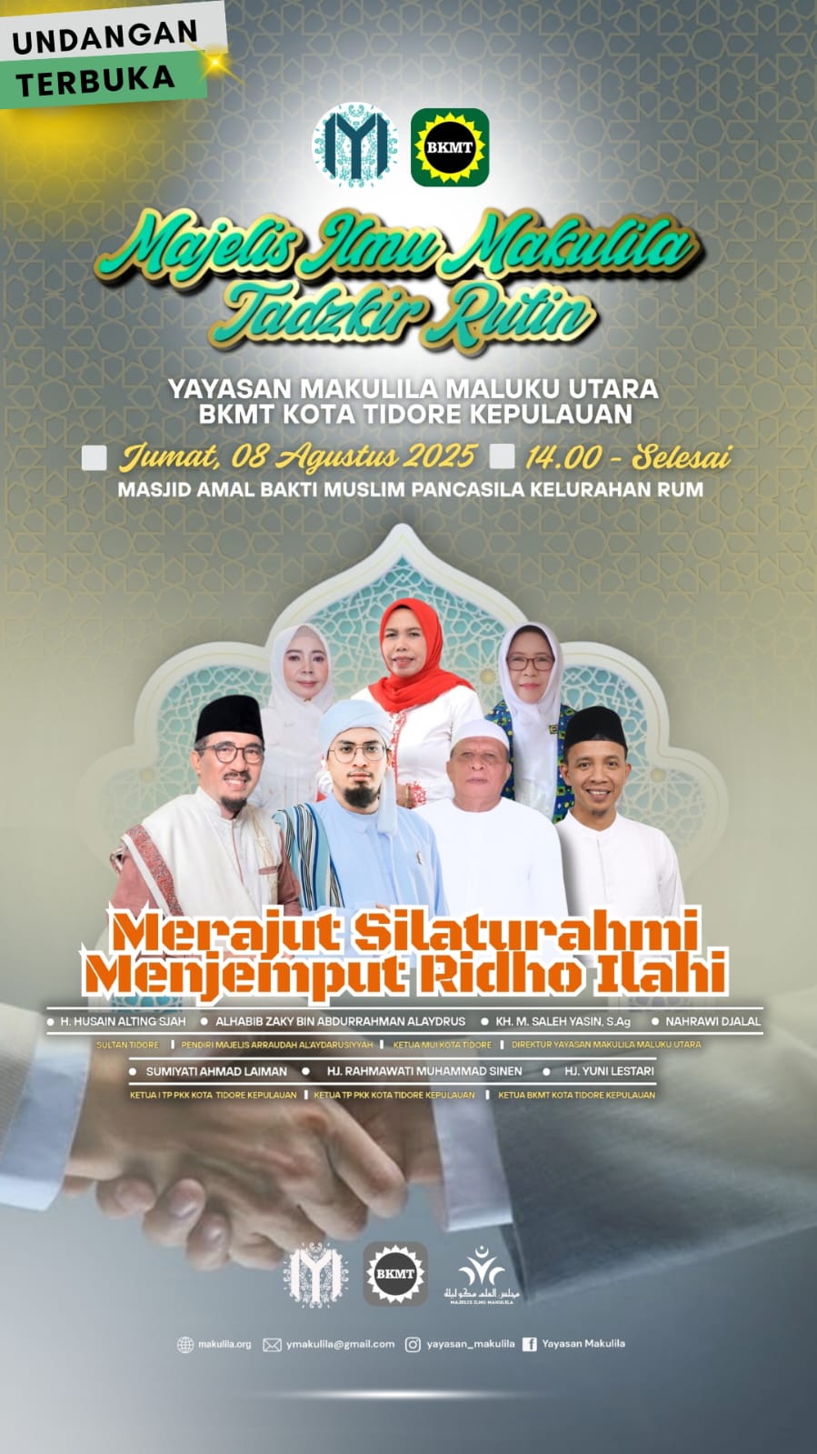 FaduliNews – Tidore, 7 Agustus 2025,Yayasan Makulila Maluku Utara bekerja sama dengan Badan Kontak Majelis Taklim (BKMT) Kota Tidore Kepulauan akan kembali menggelar Majelis Ilmu Makulila – Tadẕkir Rutin pada Jumat, 8 Agustus 2025. Kegiatan ini akan dilangsungkan di Masjid Amal Bakti Muslim Pancasila, Kelurahan Rum, mulai pukul 14.00 WIT hingga selesai.